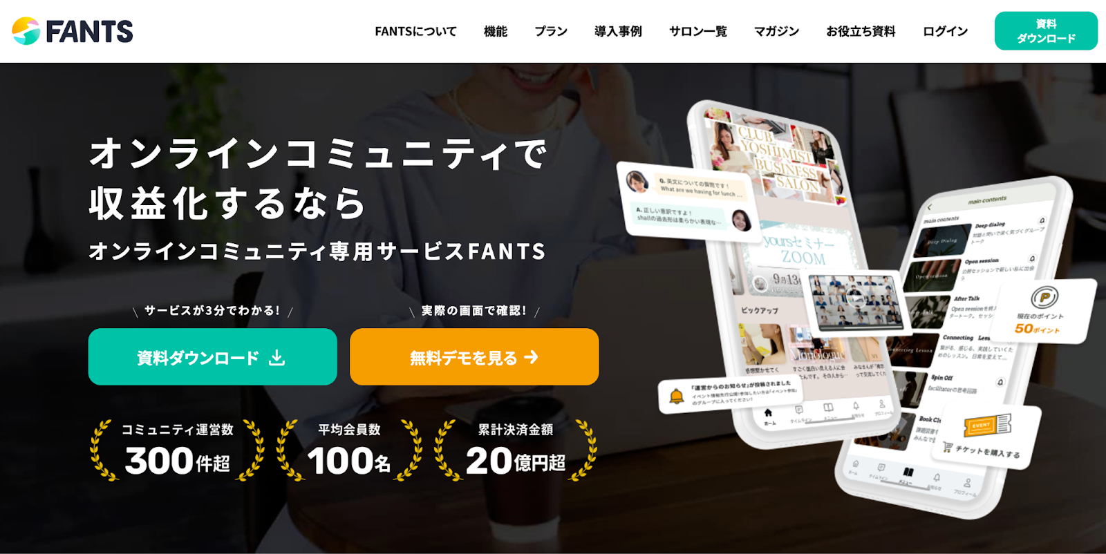FANTSはオンラインサロンに特化したオールインワンプラットフォームで、専用アプリで投稿・ライブ配信・チャットが完結します。決済と会員管理が自動連携し、複数プランや自動更新、EC機能も充実。カスタマイズ自由度が高く、スマホ・PC対応で通知も即時対応です。